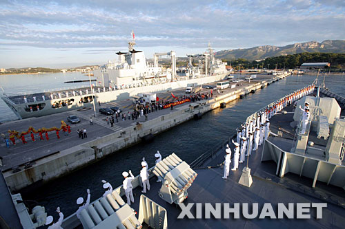 ![]() 9月25日,在法国土伦军港,法国海军列队目送中国海军舰艇编队“广州”号导弹驱逐舰踏上归程。新华社记者 宋立东摄