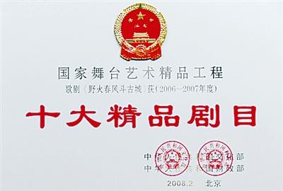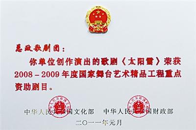 今年1月中旬,在“2008-2009年度国家舞台艺术精品工程重点资助剧目”颁奖会上,又传来《太阳雪》当选消息。这继《野火春风斗古城》荣膺2006-2007年度十大精品剧目之后的又一荣光,让总政歌剧团拥有了政府级“名头”:“全军文艺团体和全国歌剧院团中连续两次获此殊荣的唯一艺术团体”。