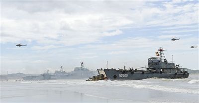 8月14日,南京军区某装甲旅联合海军、空军部队在某海域组织联合抢滩登陆训练,锤炼联合登陆作战能力。