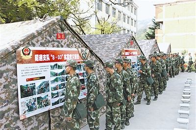 10月21日,武警云南总队昭通支队组织新兵走进鲁甸地震灾区,观看抗震救灾纪录片和宣传展板,把救灾战场变为教育课堂。夏长明 摄