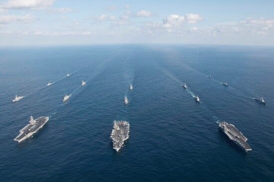 本月11日至14日,美军派出“罗纳德·里根”号、“西奥多·罗斯福”号和“尼米兹”号三艘核动力航母和11艘宙斯盾驱逐舰进入日本海和朝鲜半岛东部海域分别与日本和韩国举行联合军演。