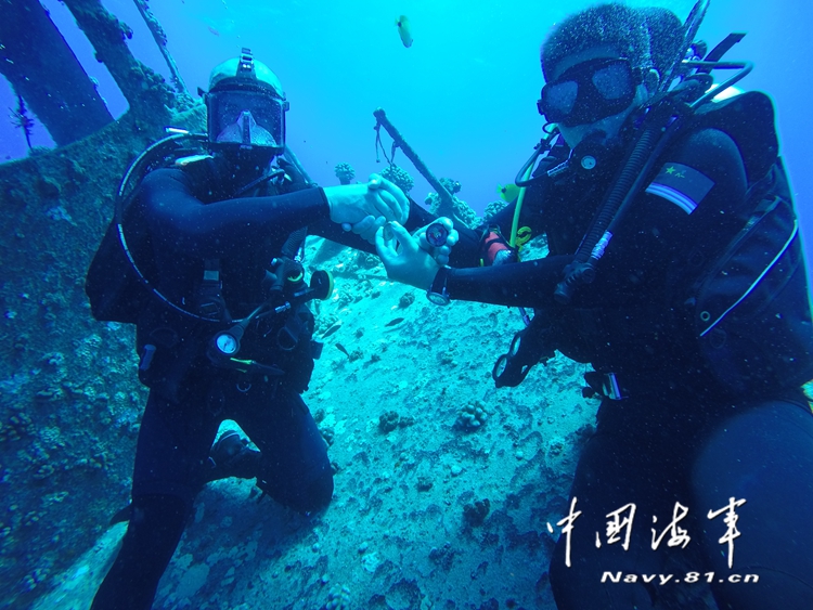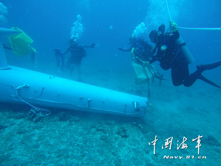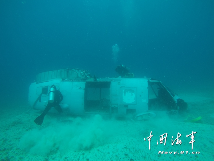 中国潜水员与美加潜水员联合对直升机残骸进行水下探摸演练。韩富晓 摄