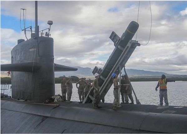 7月3日,在夏威夷珍珠港举行的环太演习中,水兵将一枚“鱼叉”式反舰巡航导弹装入“奥林匹亚”号攻击潜艇。(美国《星条旗报》网站)