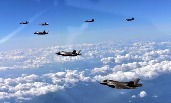 资料图片:隶属于美军“绿骑士”中队的F-35B隐身战机与韩军F-15K战机在半岛上空编队飞行。(图片来源于网络)