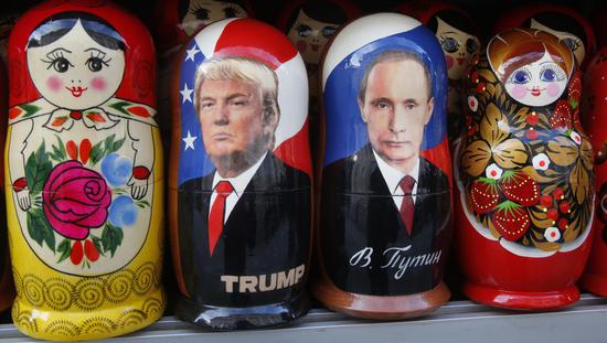 俄罗斯街头出售的特朗普和普京形象的套娃与此同时,俄罗斯的媒体结成“反奥巴马”联盟——尽管在普京自2012年开始的第三个总统任期内,美俄关系这对非常重要的双边关系在俄罗斯电视媒体上的曝光度与两国关系的重要程度严重不成比例。随着特朗普在竞选中高歌猛进,普京的忠诚追随者们(比如德米特里·基谢廖夫)发现了一个新的、毫无预兆的朋友。