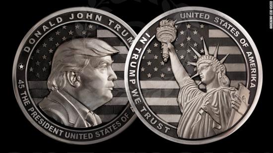 俄罗斯出售的特朗普当选美国总统的纪念币当然,欢庆特朗普当选的庆典也不在少数。在莫斯科,一群支持普京的“反美国家自由运动”在大选当天和特朗普就职当天举行了香槟庆祝活动。