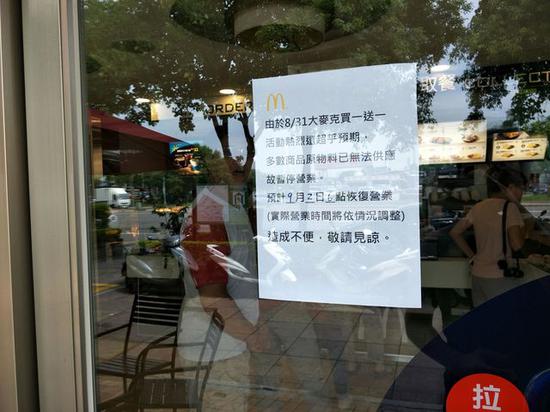 麦当劳表示,麦当劳买一送一活动热烈,兑换情形热烈远超过预期,造成部份原物料供应不及,同时为体恤员工辛劳,今天上午10:30后大部份餐厅暂停营业;唯有百货、卖场、学校、交通转运站相关类型的餐厅,将视情形营业。明天早餐时段自6:00起,麦当劳各餐厅将陆续恢复营业,所提供之餐点选择,将以各餐厅实际供应为准。