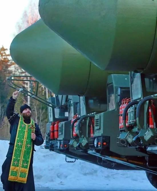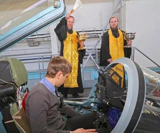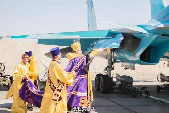 图为俄罗斯阿穆尔河畔共青城飞机制造厂,最新式苏-35战斗机出厂前的宗教仪式,东正教牧师对其播洒圣水,俄国人相信经过牧师开光的战斗机,性能会得到显著提升。由此可见宗教对于俄罗斯军队的巨大影响。