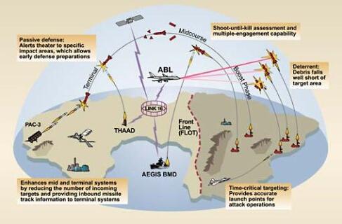 2002年底,美国放弃了原先对国家、战区导弹防御系统的区分(即NMD与TMD),转而整合全球的反导资源。新的一体化反导指挥控制体系(C2BMC)基于来袭导弹的不同飞行阶段进行分层拦阻,并将全球各战区与美国本土弹道导弹防御系统(BMDS)进行了一体化整合,特别是原有相互独立、点对点的指挥控制、作战管理和通信节点。