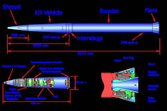 系统的拦截弹由一级固体助推火箭和作为弹头的KKV(动能杀伤飞行器)组成。全弹长6.17米,起飞重量约 600公斤。KKV主要由用于捕获和跟踪目标的中波红外导引头、信号处理机、数字处理机、采用激光陀螺的惯性测量装置和用于机动飞行的轨控与姿控推进系统等组成。红外导引头通过向弹载计算机传输目标导弹战斗部的红外成像进行制导。整个KKV(包括保护罩)长2.325米,底部直径370毫米,重量约60公斤,飞行速度为2000米/秒。