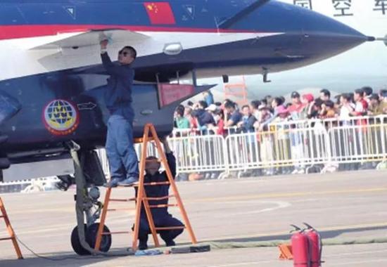 在珠海航展飞行表演的间歇,机务人员也要对歼-10表演机进行日常保养擦拭,确保部件的清洁和润滑