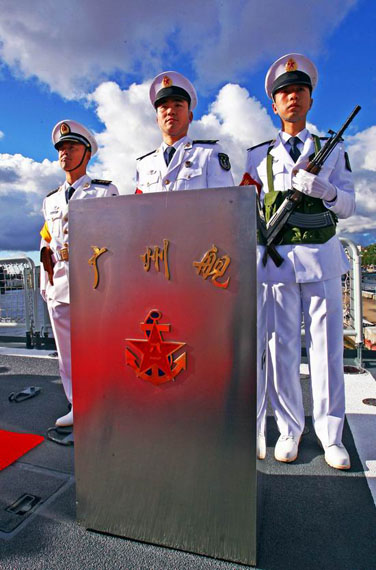 ![]() 8月27日,中国海军舰艇编队“广州”号导弹驱逐舰上1名军官和2名士兵担任值更。