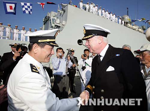 ![]() 9月6日,在英国朴茨茅斯港码头,英国皇家海军朴茨茅斯分舰队司令卡梅隆准将(右)与中国出访编队指挥员、海军南海舰队副司令员苏支前少将(左)握手致意。 新华社记者查春明摄