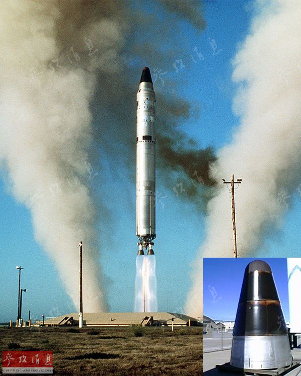 图为范登堡空军基地试射泰坦II洲际导弹的图片,如果能从博物馆发射导弹(这个点子好邪恶啊,O(∩_∩)O哈哈~),也会看到同样的场面(小图为泰坦II使用的Mk6再入器,内含有一枚W-53核弹头,当量为900万吨级TNT)。