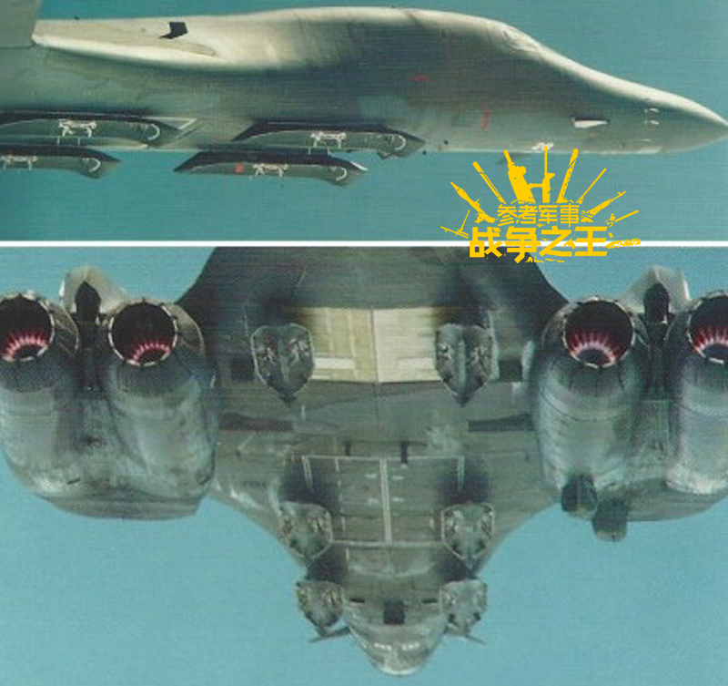 按原设计,B-1B在机身上实际还有6个外挂点,载弹量达23吨。图为B-1B挂载ACM巡航导弹外挂架进行飞行测试。但后来由于美苏《削减性战略武器条约》的相关规定,B-1B取消了外挂能力,另一大原因是因为挂武器会大幅影响飞行性能。
