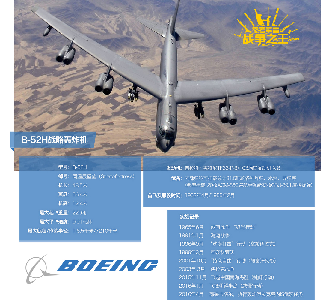 2016年4月20日,美军方证实,美空军已开始在伊拉克动用B-52H战略轰炸机使用精确制导弹药轰炸极端组织。作为波音公司最优秀的代表作之一,自1955年服役以来,B-52系列轰炸机已在全球征战了半个多世纪。至今其仍是美国空军的战略核威慑主力之一。据外媒报道,B-52将服役至2040年,届时或将获得服役最长军机的称号。