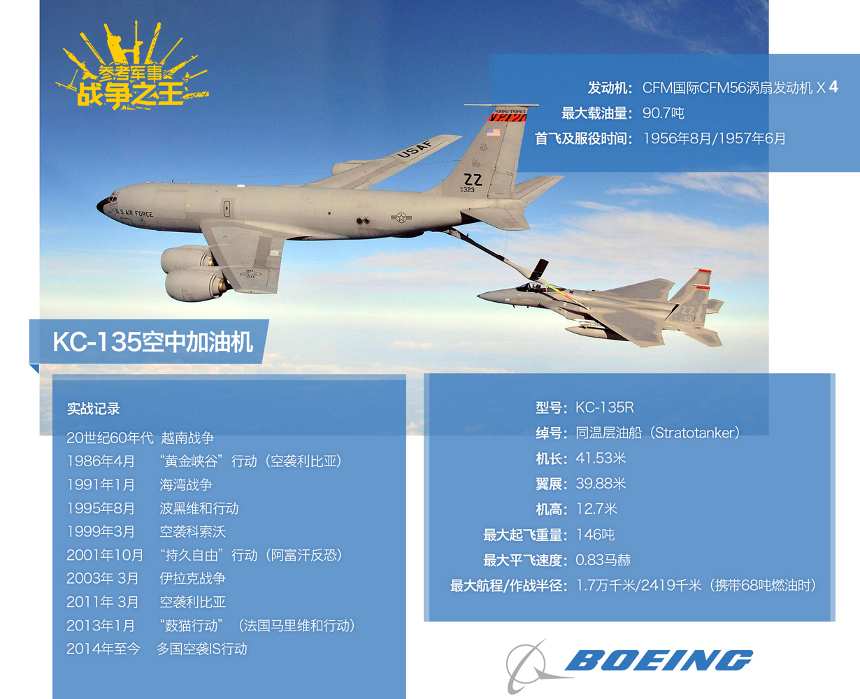 KC-135系列加油机同样基于707改进而来,其服役时间之长,仅次于B-52,是美空军的功勋机种之一,从越战到最近的空袭IS行动,都能看到该型机的身影。