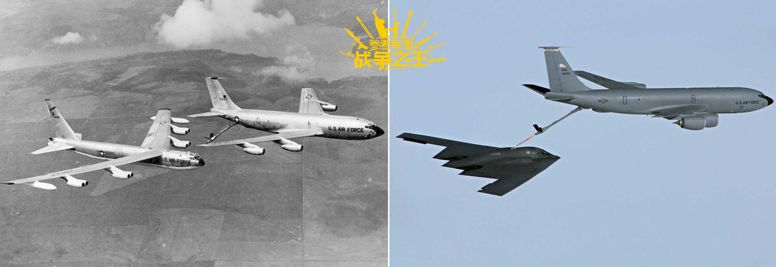 用“多朝元老”来形容KC-135十分贴切,左图为KC-135为B-52D轰炸机加油,右图为KC-135为B-2隐身轰炸机加油。