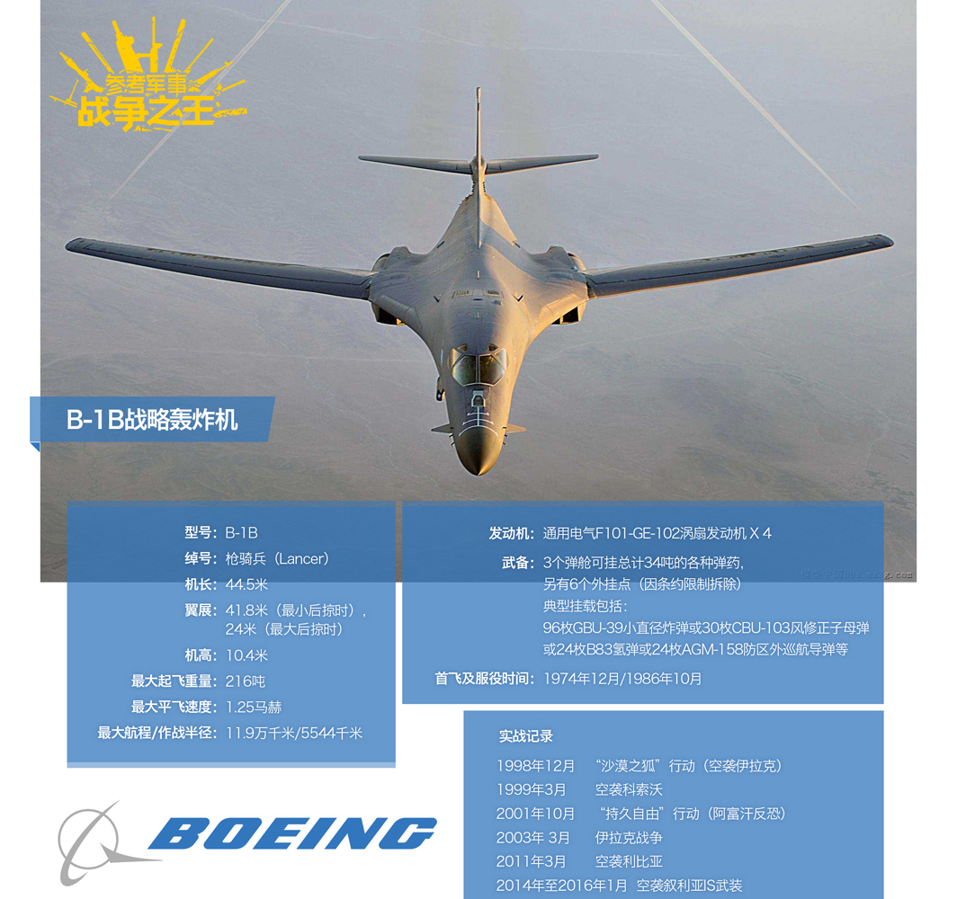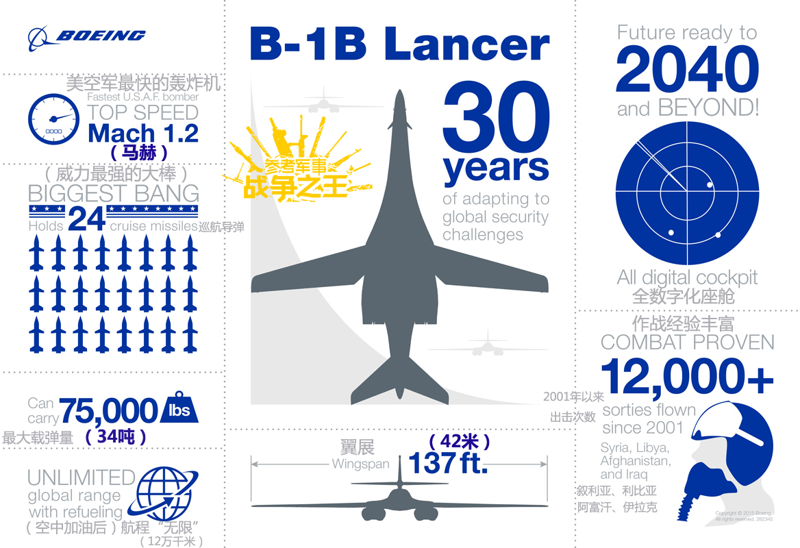 图为美国波音公司(罗克韦尔后被波音公司收购))制作的B-1B数图,其中从2001年至2015年以来,B-1B机群的总出击架子数超过了1.2万架次。据美军统计,在2014年8月至2015年1月,针对”伊斯兰国“极端组织的空袭行动中,B-1B的投弹量占到了美军战机投弹总量的80%。