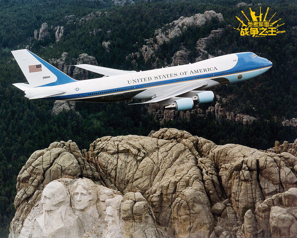 美国总统专机“空军一号”一直以来也都选用波音公司的产品,图为VC-25(空军一号的美军编号)飞越拉什莫尔山。