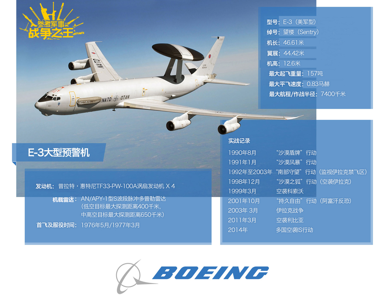 E-3系列是基于波音707改进而来的大型预警机,其自1977年服役以来, 至今仍是美国空军的主力预警机,参加过多场局部战争,并有出色表现,被喻为空军战力倍增器。
