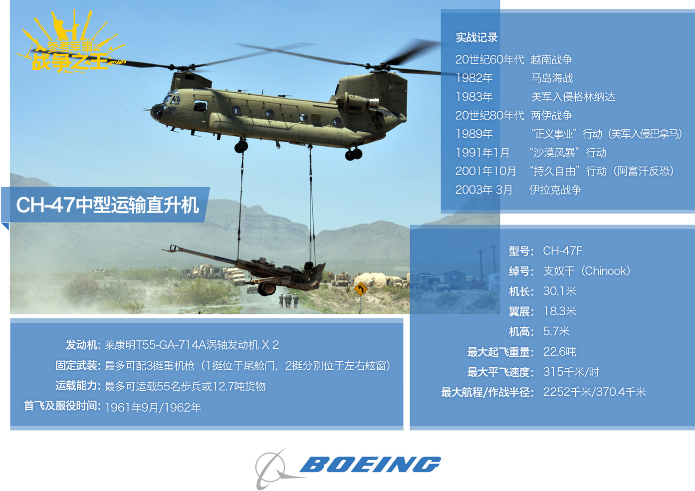 CH-47系列运输直升机是波音的经典机型之一,从最初投入越战至今,仍是作为美国陆航的运输主力,活跃在阿富汗反恐战场最前线。