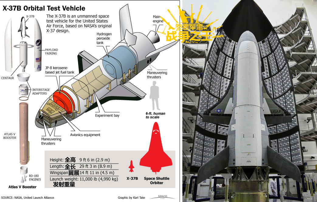 左图展示了X-37B的内部结构和整体尺寸,可见其尺寸远小于航天飞机。右图为2010年4月,在美国佛罗里达州卡拉维拉尔角发射中心拍摄的正在总装(准备发射)的X-37B空天飞机资料图。