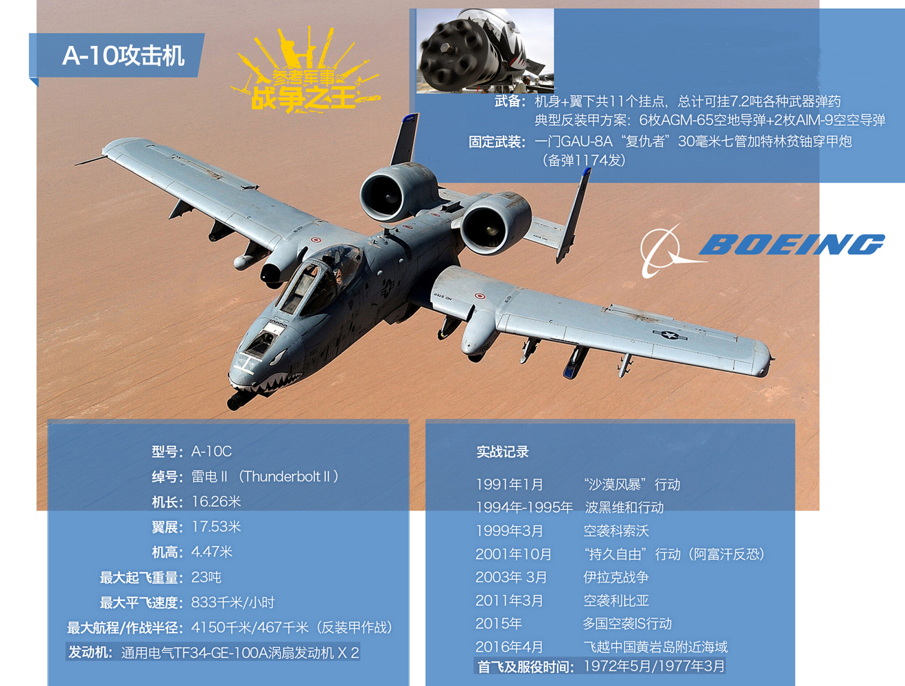 2016年4月27日,据美国《华盛顿邮报》网站发表评论文章称,美空军近期出动4架A-10C攻击机在中国黄岩岛附近空域执行飞行任务,再次引起了世人对这种经典攻击机的关注。A-10原由美国费尔柴尔德公司研发,后来该型机的相关改进项目被波音公司买断,也算并入了波音旗下。