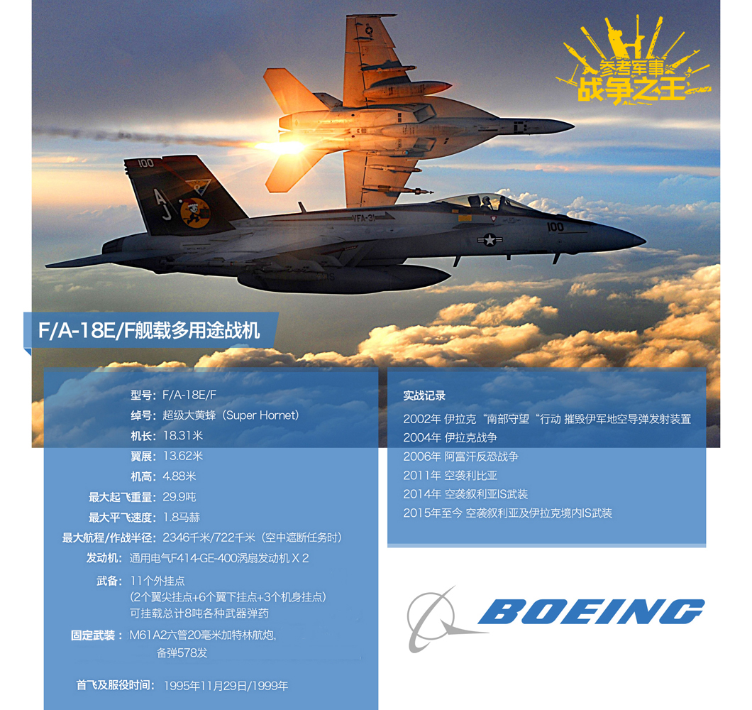 F/A-18E/F是波音基于原麦道F-18系列改进研发的多用途舰载战机,是美海军航空兵的现役主力机型。