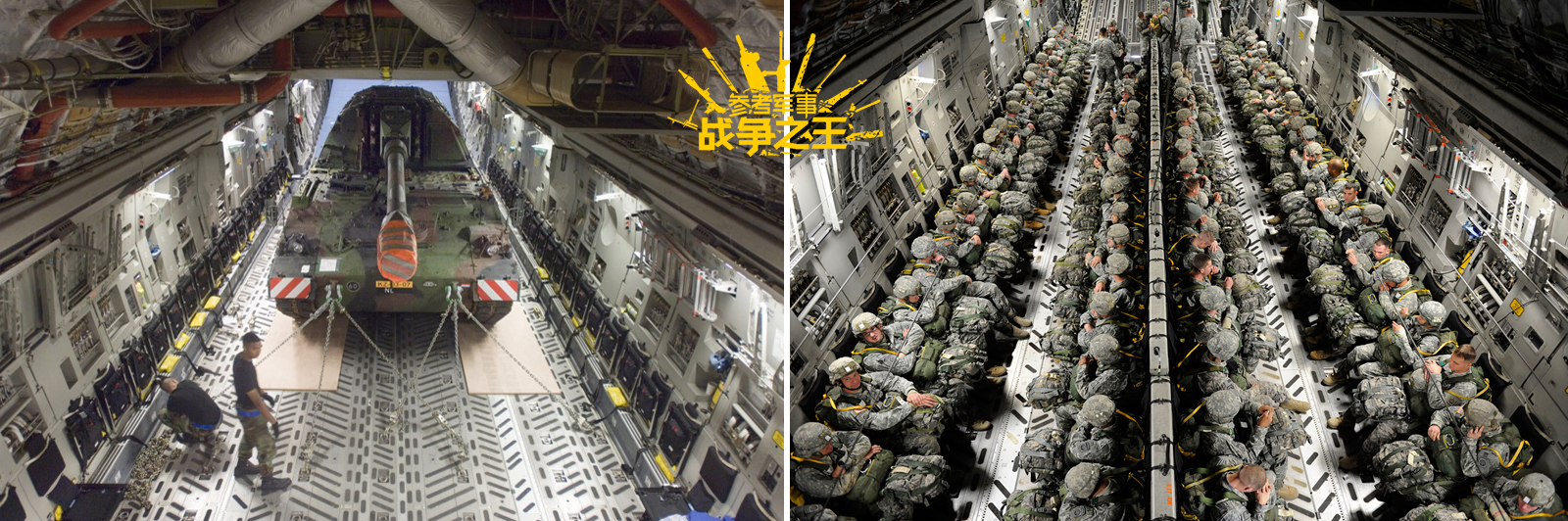 关于C-17的运载能力,可以通过这两张图来直观表现,左图为运载德制Pzh-2000自行榴弹炮,右图为第82空降师士兵搭乘C-17空投训练。