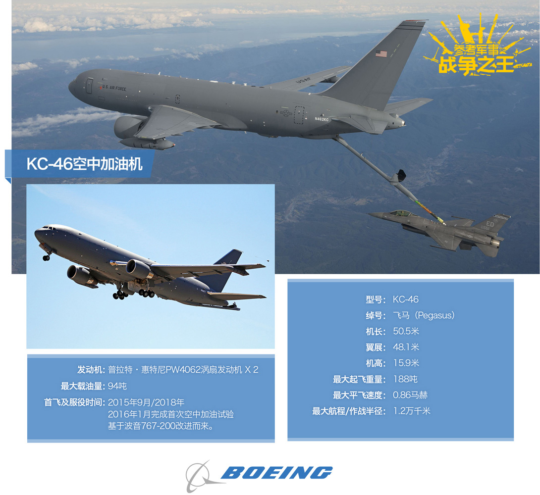 KC-46是波音为美空军打造的新一代加油机,基于波音767-200客机改造而来。其主要用于替代年事已高的KC-135系列加油机,刚于今年1月完成了首次空中加油试验。预计将于2018年正式服役,美空军预计将采购179架KC-46。