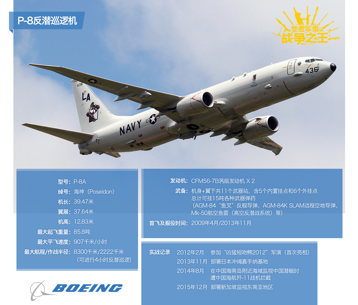 从P-8A“海神”反潜巡逻机开始是一个例外,该型机是基于波音-737-800ERX客机改进而来。P-8A近年来也成为了新闻上的热点机型,频繁出现在中国沿海地区。最出名的一次莫过于2014年8月,在中国海南岛附近海域遭到了中国海航歼-11战机的“专业拦截”。