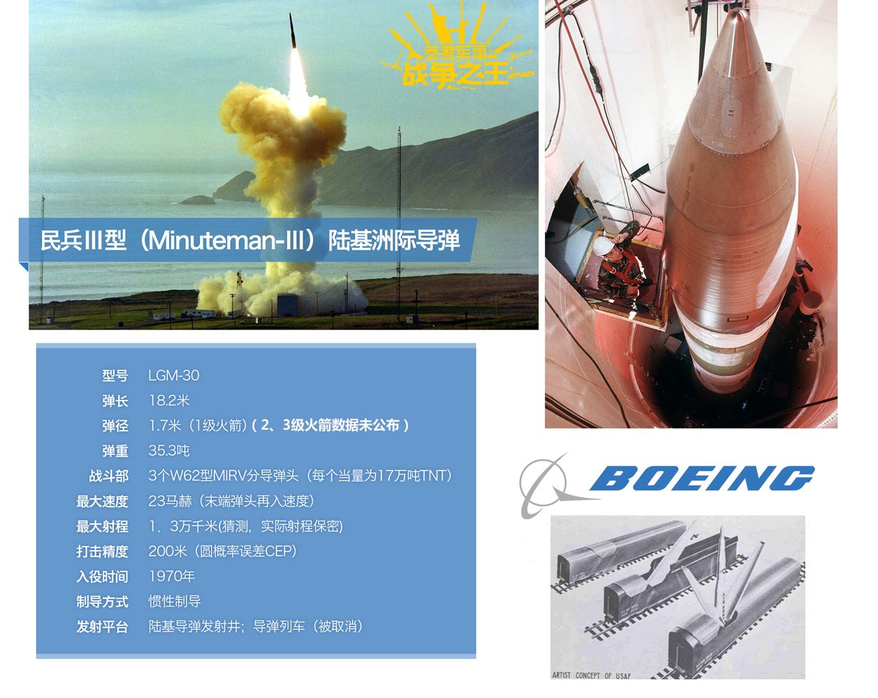 作为美国“三位一体”战略核打击体系的重要一环,450枚“民兵III”洲际导弹构成了美国陆基(井射)战略核打击的核心。值得一提的是,民兵III是美国第三代战略核导弹(三级固体燃料火箭推进),同时也是历史上第一种能携带分导式多弹头(MIRV)的洲际导弹。而这种战略重锤也是出自波音公司旗下。右下图为已取消的导弹列车设想图。