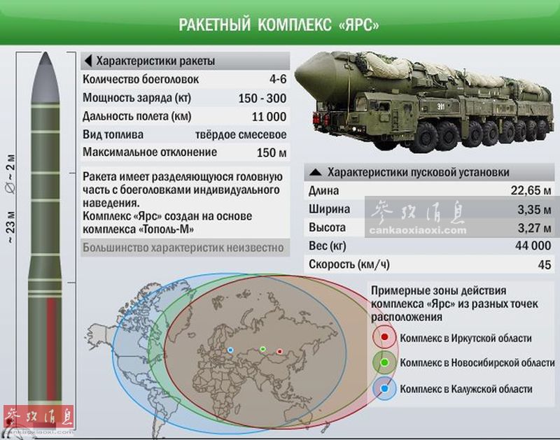 RS-24“亚尔斯”是俄军现役最新的固体燃料洲际导弹,其最大射程超过1.1万千米,可携带6个分导弹头,每个弹头当量可达30万吨TNT。图为RS-24“亚尔斯”洲际导弹射程示意图。