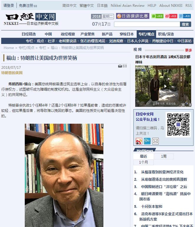 【环球网报道 记者 王欢】《日本经济新闻》中文网7月17日刊登美国哈佛大学知名日裔学者弗朗西斯·福山的署名文章。在文章中,福山批评特朗普“把全世界变为敌人,同时发动多起贸易战争”,“让美国沦为全世界的笑柄”。但他同时表示,相信特朗普有连任的充分可能性。
