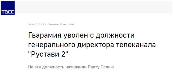 据俄塔社报道,“鲁斯塔维-2”电视台股东、商人哈尔瓦什(Kibar Halwashi)18日解雇了原台长尼克·格瓦拉米亚的职务,并任命其律师帕托·萨利亚担任台长职务,相应的职务变化已在格鲁吉亚司法部注册官网上公布。