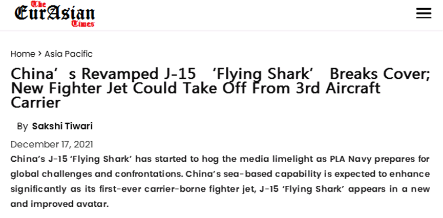 该报道还注意到,在12月15日的另一篇文章中,沈飞公司表示,“截至当天,公司已完成2021年的所有制造和试飞,飞机制造和交付均创下新高。”报道认为,“这可以被视为一个微妙的信号,表明改进型歼-15正与新航母的下水时间表同步推进”。