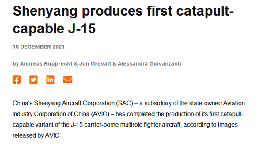 英国简氏防务网站直言:“这就是弹射版歼-15战斗机”
