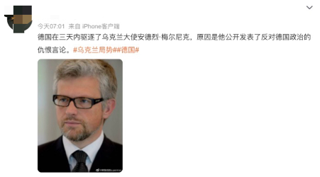 近日,微博上流传一则消息称:“德国在三天内驱逐了乌克兰大使安德烈·梅尔尼克,原因是他公开发表了反对德国政治的仇恨言论。”