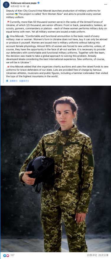 - 基辅市议员伊琳娜·妮可拉科上月启动“现在就武装女性”倡议,为在伍女兵解决服装不合身问题,此举并非为“大规模征召女兵”作准备。