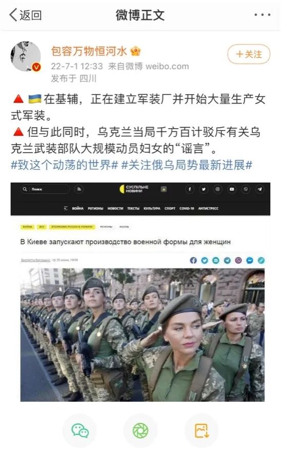 近日,有微博用户表示,“乌克兰正在建立军装厂并且开始大量生产女式军装。但与此同时,乌克兰当局千方百计驳斥有关乌克兰武装部队大规模动员妇女的 ‘谣言’。”暗指乌军动员女性参战确有其事。