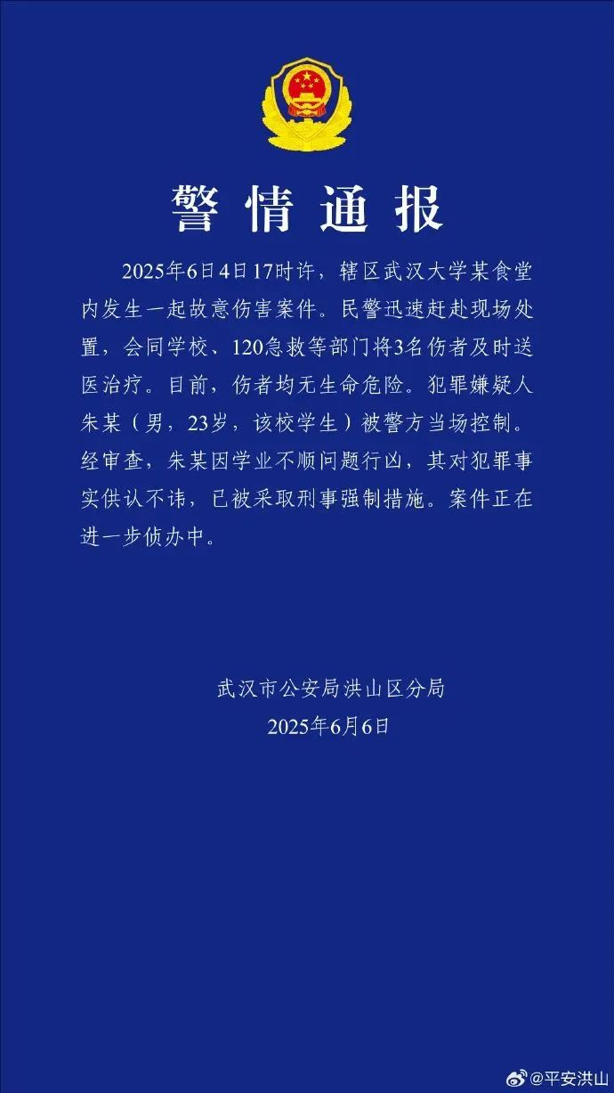 6月6日,武汉市公安局洪山区分局通报:6日4日17时许,辖区武汉大学某食堂内发生一起故意伤害案件。民警迅速赶赴现场处置,会同学校、120急救等部门将3名伤者及时送医治疗。目前,伤者均无生命危险。犯罪嫌疑人朱某(男,23岁,该校学生)被警方当场控制。经审查,朱某因学业不顺问题行凶,其对犯罪事实供认不讳,已被采取刑事强制措施。案件正在进一步侦办中。