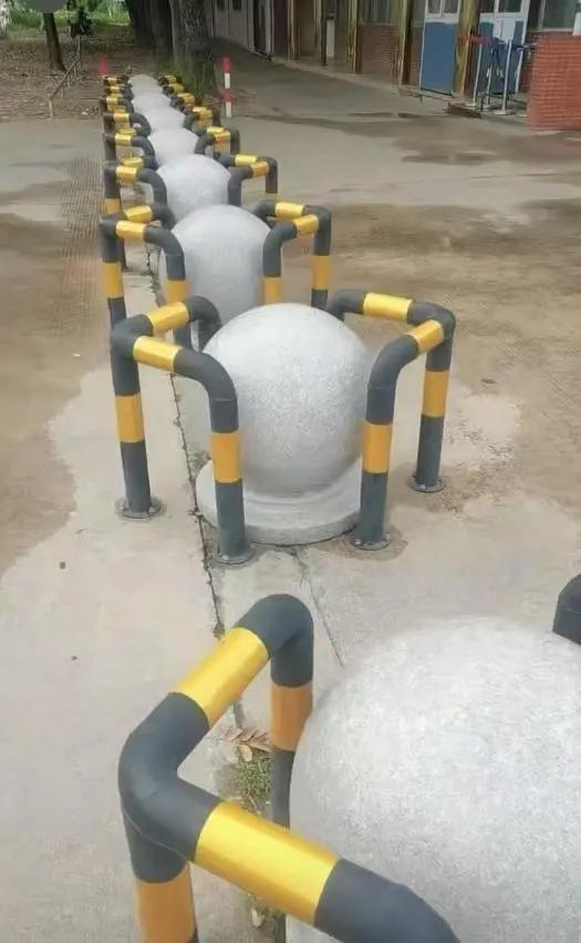 广东一学校门外石墩圆球加设钢管护栏,网友质疑多此一举,学校回应:是出于安全考虑,加装为防车辆撞击。