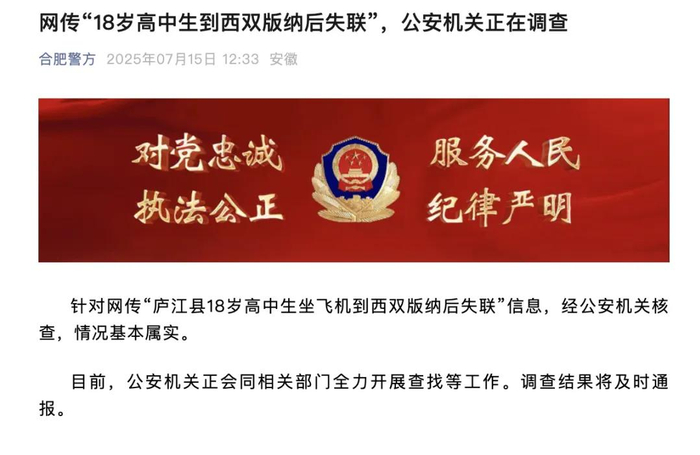 据“合肥警方”微信公众号7月15日消息,针对网传“庐江县18岁高中生坐飞机到西双版纳后失联”信息,经公安机关核查,情况基本属实。