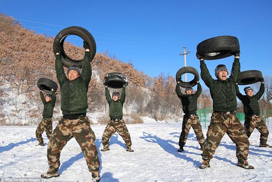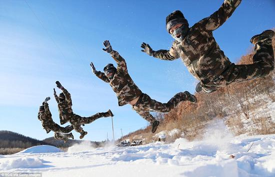 据英国《每日邮报》21日报道,惊人的图片显示了中国军人在严冬中训练的场景。