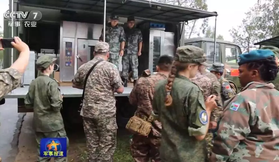 比赛开始前,其他国家参赛代表队参观中国代表队携带的野战炊事车(央视报道截图)