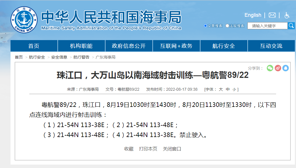 珠江口,大万山岛以南海域射击训练—粤航警89/22