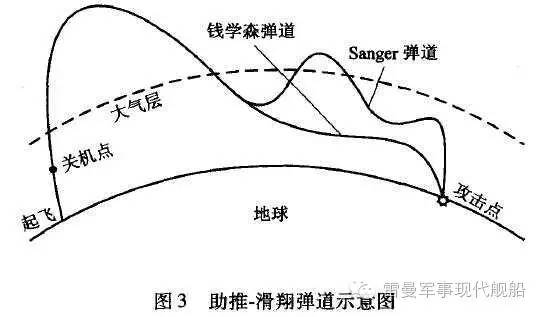 目前我国已经成功实验了4次高超音速飞行器,均是此类。另外一种弹道叫做“桑格尔弹道” (sanger),其原理与钱学森弹道完全一样。只是在弹头再入大气层时,弹头上的弹翼调整偏转角度给予导弹一个向上的升力,于是导弹再次跃升脱离大气层,而后由于重力的影响再次返回,在大气层边界形成一系列的波状飞行轨迹,犹如打水漂。这样的飞行轨迹使得反导系统的火控计算机无法预测其位置,导致导弹无法击中。