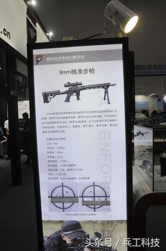 根据展板的资料介绍,XY9毫米精准步枪,是根据反恐实战需求开发研制的近距离精确打击武器,使用92式9毫米普通手枪弹,通用92式9毫米手枪弹匣,可以准确打击100米距离的有生目标,使用9毫米精度弹,在100米距离内可以精确打击有生目标。该枪体积小、重量轻,便于携行,操作方便,是近距离反恐的理想的武器。