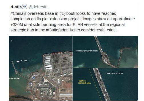 美国《福布斯》新闻于报道称,我国在吉布提基地的卫星照片,可以看到,这座基地已经成为一座长城一样的要塞,内部空间很大,还有大型直升机机场,有护城河,还有塔楼和城墙,甚至还有城墙垛口。